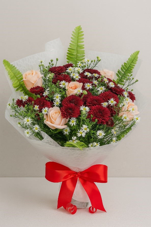 Bring a touch of timeless elegance to any occasion with our Classic Romance Mixed Bouquet. This thoughtfully curated arrangement features deep burgundy chrysanthemums, soft peach roses, and cheerful white daisies, all delicately interwoven with lush seasonal greens and wrapped in a sophisticated ice-patterned cellophane. Finished with a bold red satin ribbon, this bouquet strikes the perfect balance between warmth, passion, and charm.