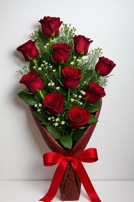 Wrapped in textured red floral paper and tied with a bold satin ribbon, this bouquet is perfect for romantic occasions, anniversaries, or simply to show someone you care.