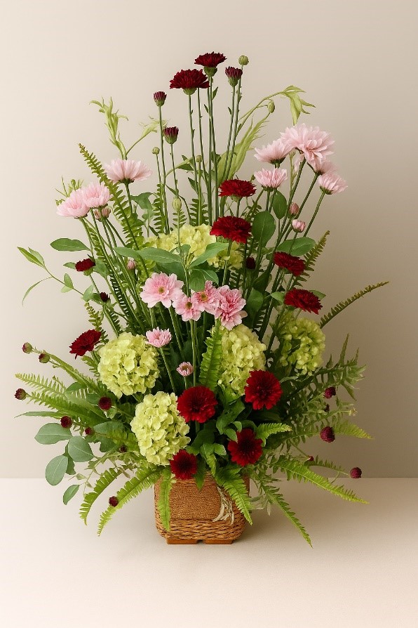 This arrangement features soft pink chrysanthemums, known for their delicate petals and joyful symbolism, paired with deep burgundy carnations that add rich contrast and represent love and admiration. Nestled among them are voluminous green hydrangeas, bringing a sense of abundance and natural beauty, while vibrant green button mums provide a playful touch of color and texture.