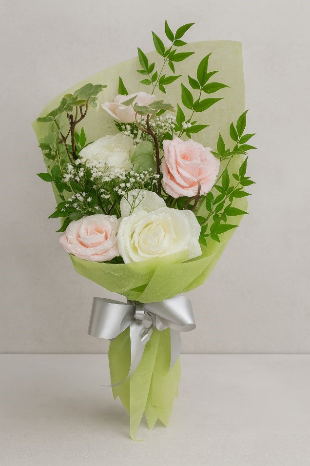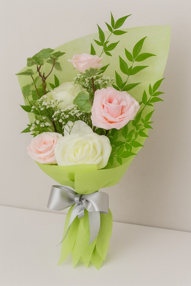 Delicately crafted to convey grace and charm, our Elegant Pastel Rose Bouquet features a stunning arrangement of soft pink and creamy white artificial roses, accented with sprigs of baby’s breath and lush greenery. Wrapped in a sheer mint green paper and finished with a luxurious silver satin ribbon, this bouquet offers timeless beauty with zero maintenance.