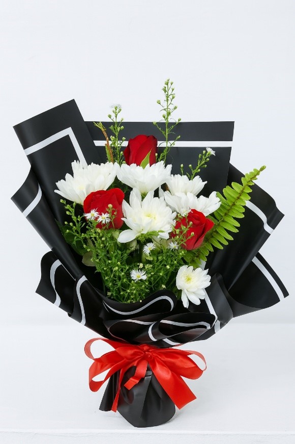 Make a timeless statement with our Crimson Grace Bouquet, a sophisticated arrangement that perfectly balances elegance and passion. Featuring velvety red roses nestled among pristine white chrysanthemums and daisy-like asters, this bouquet exudes charm and refinement. The blooms are complemented by fresh greenery and expertly wrapped in bold black paper with crisp white accents, finished with a striking red satin ribbon.